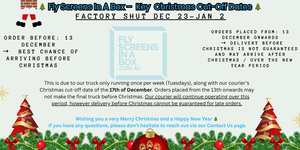 Fly Screens In a Box custom cut your fly frame to your measurements in your choice of colour. You can choose from either standard fibreglass mesh, midge mesh, pet mesh and bushfire mesh (316 stainless steel).